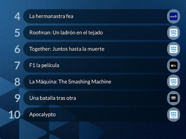 Por su parte, Jurassic World Rebirth, disponible en HBO Max, y Eternity, en Apple TV+, ocupan el segundo y tercer lugar respectivamente, ambos ingresando por primera vez al listado.